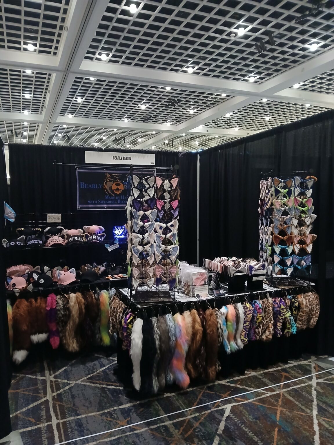 Bearly Begun makes animal themed ears, tails and accessories. These allow folks to bring joy and whimsy to their day. I focus on everyday wearable items like ears, trucker hats, and tails. This is not only an easy-on-the-wallet option which is accessible to all, but allows a practical way to express your furry side anywhere. I also include options for different sensory sensitivities like clip on ears, magnetic ears, etc. Everyone should be able to let their inner creatures out to roar! Each item is hand made with swearing, blood and love. You may find pictures of Bearly Begun booth set ups and products at my website https://www.bearlybegun.com