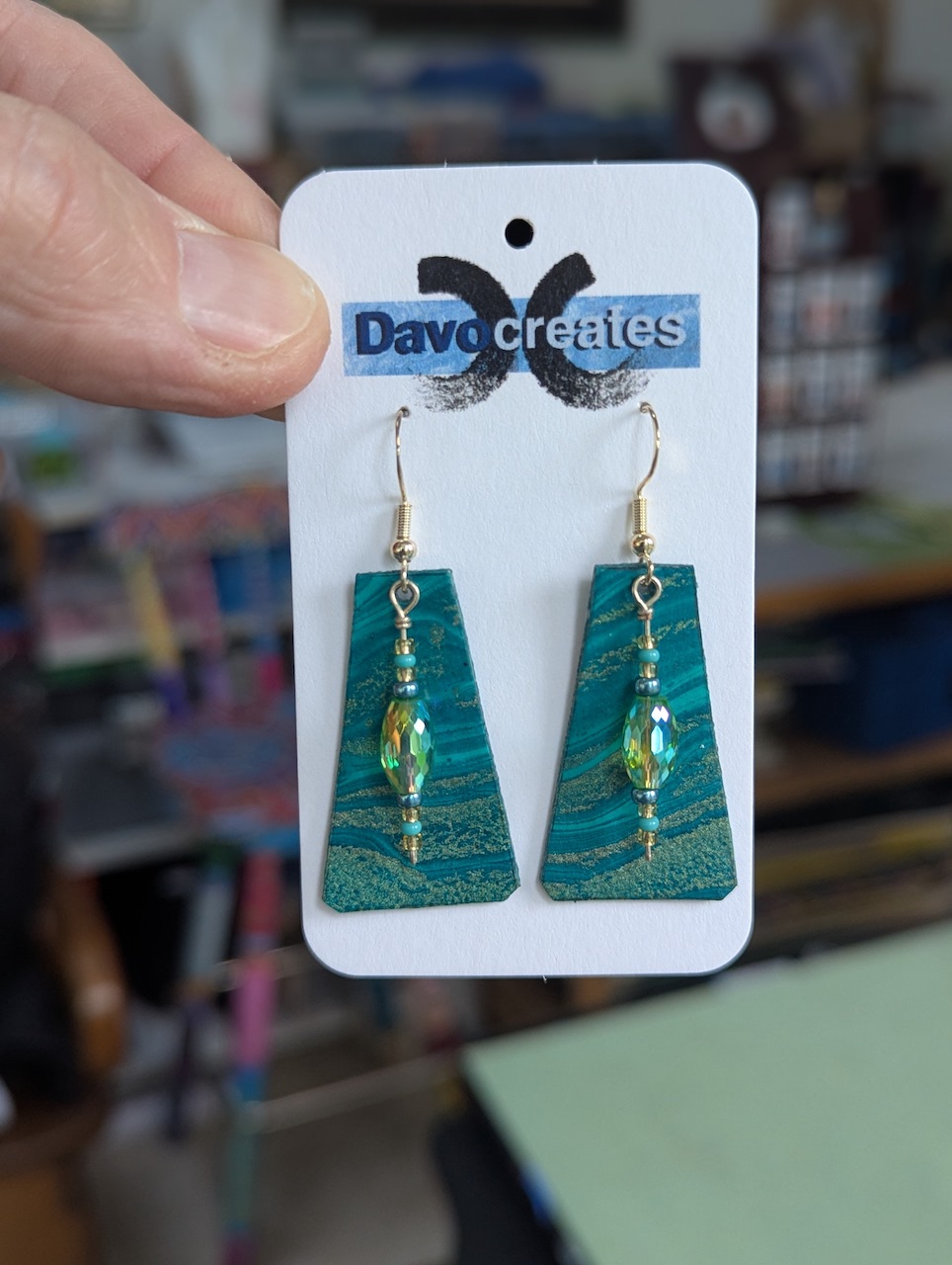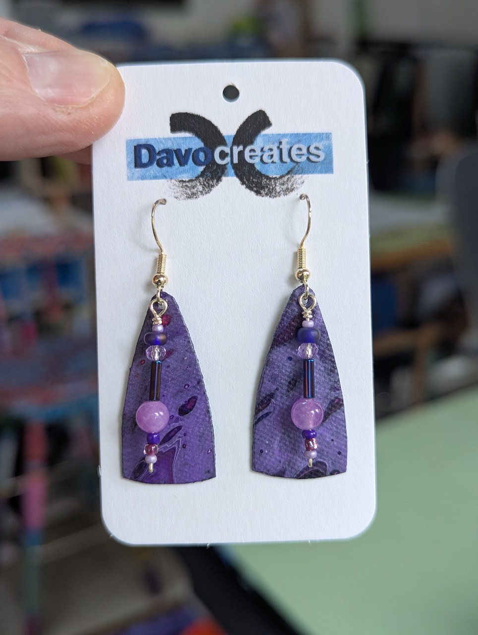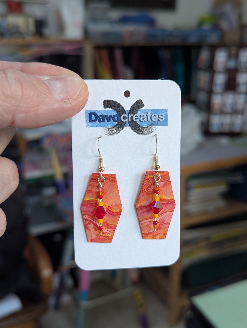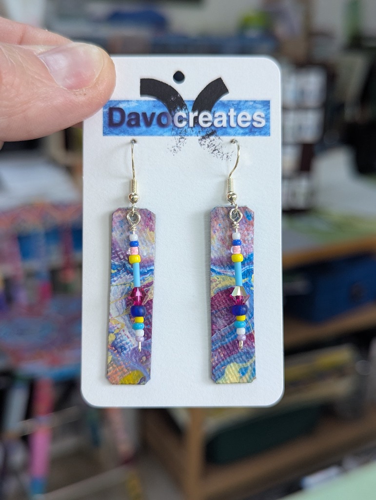 Davocreates earrings are unique being made out of my acrylic paintings. Each pair is a work of art in itself where no two are alike. They are double sided and coated for UV light and water resistance. They are mounted on .925 sterling silver for people with ear sensitivity.