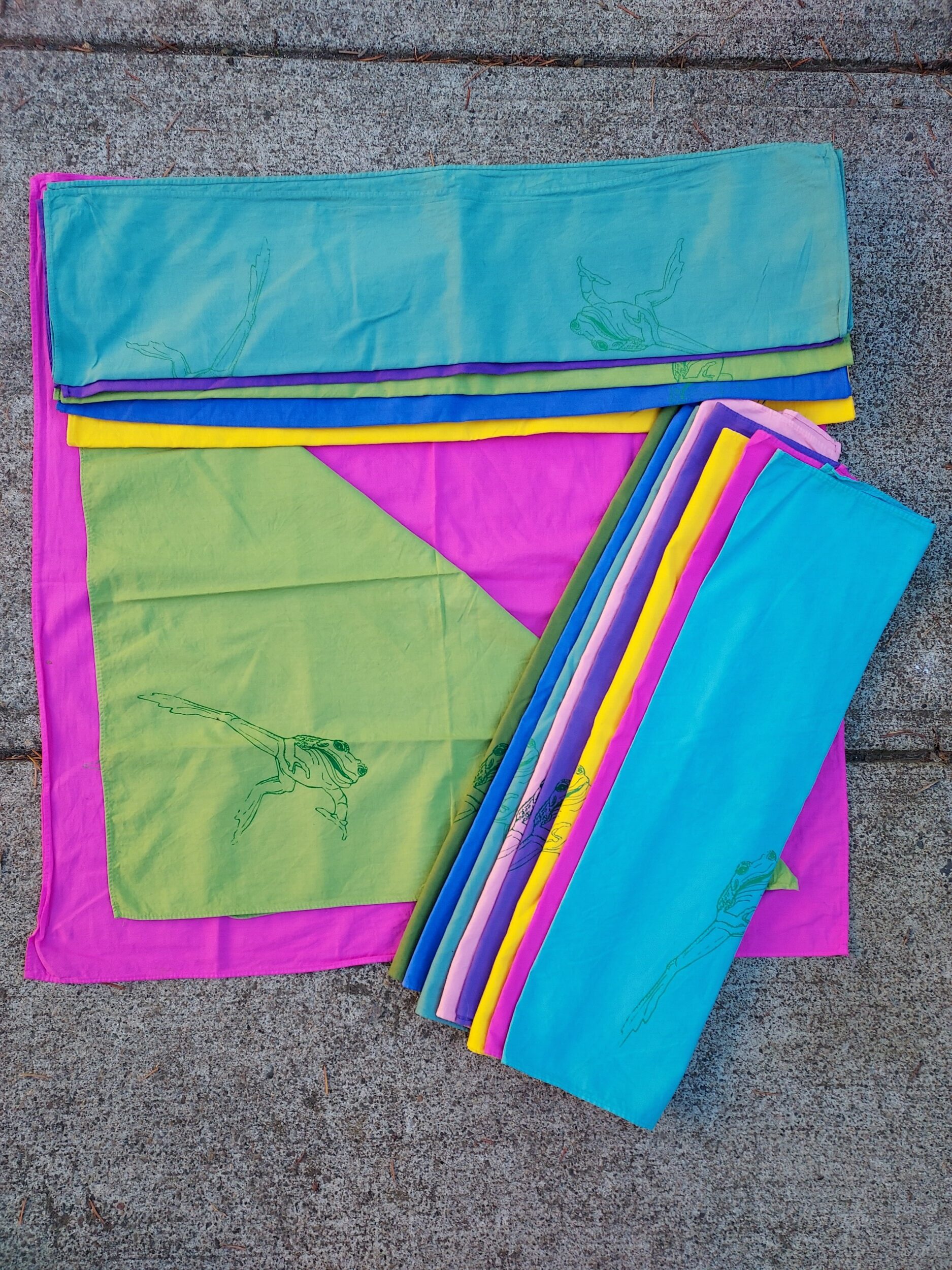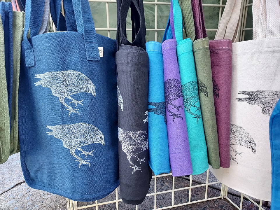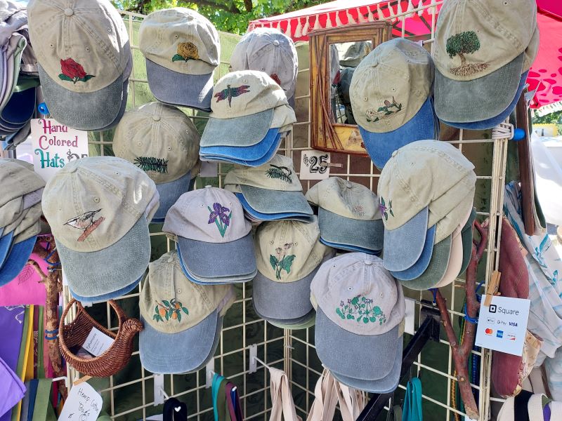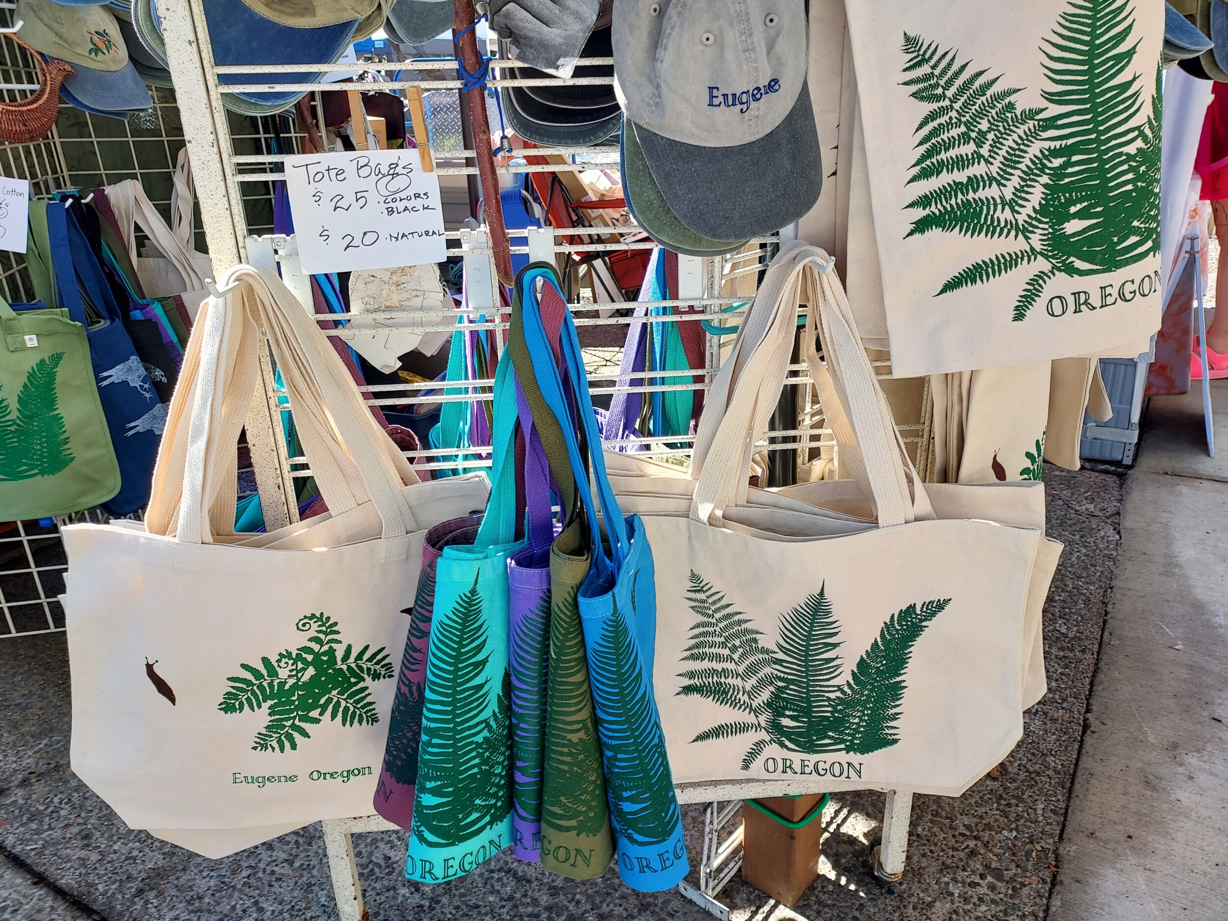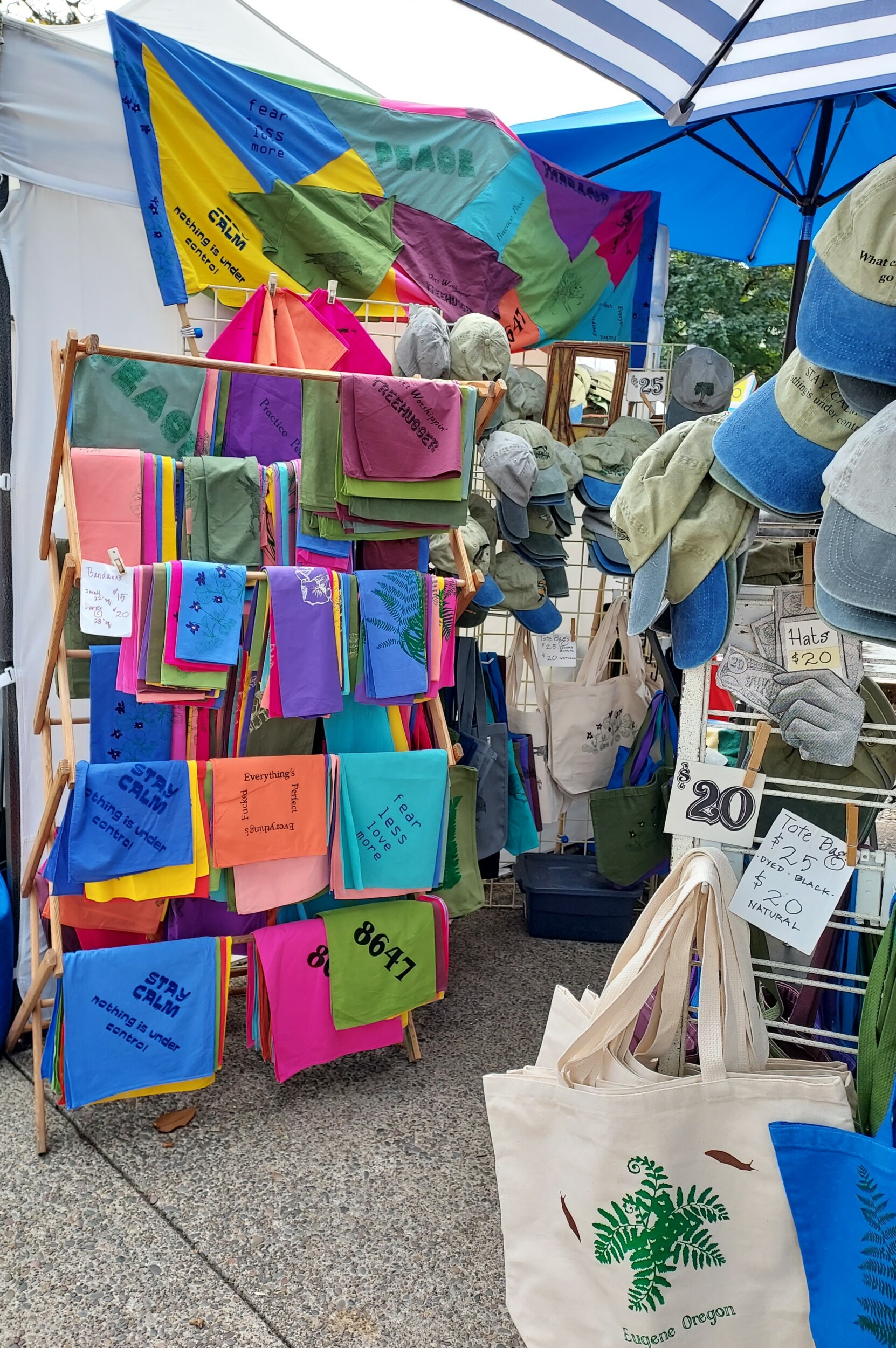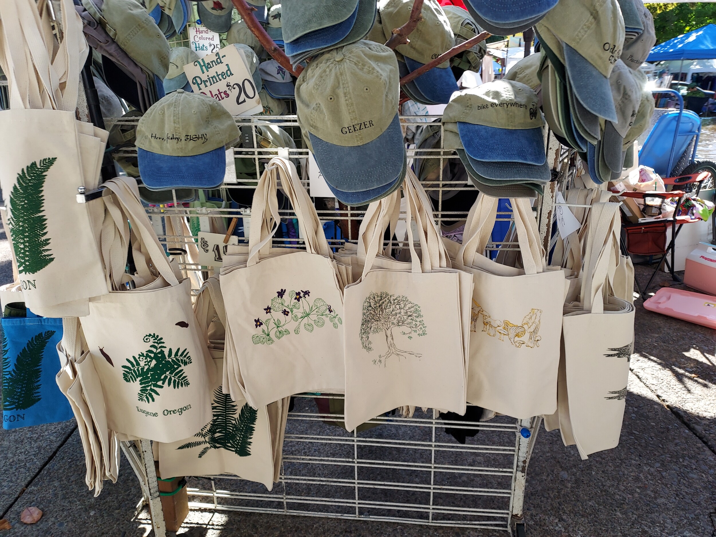 I’ve been selling at Saturday Market for 50 years, starting in 1976. I am a self-taught artisan and now make screenprinted and hand-colored baseball caps, and locally made tote bags in three sizes. All of my designs are hand-drawn and I dye bags and bandanas, decorating them with my hand-printed nature images.