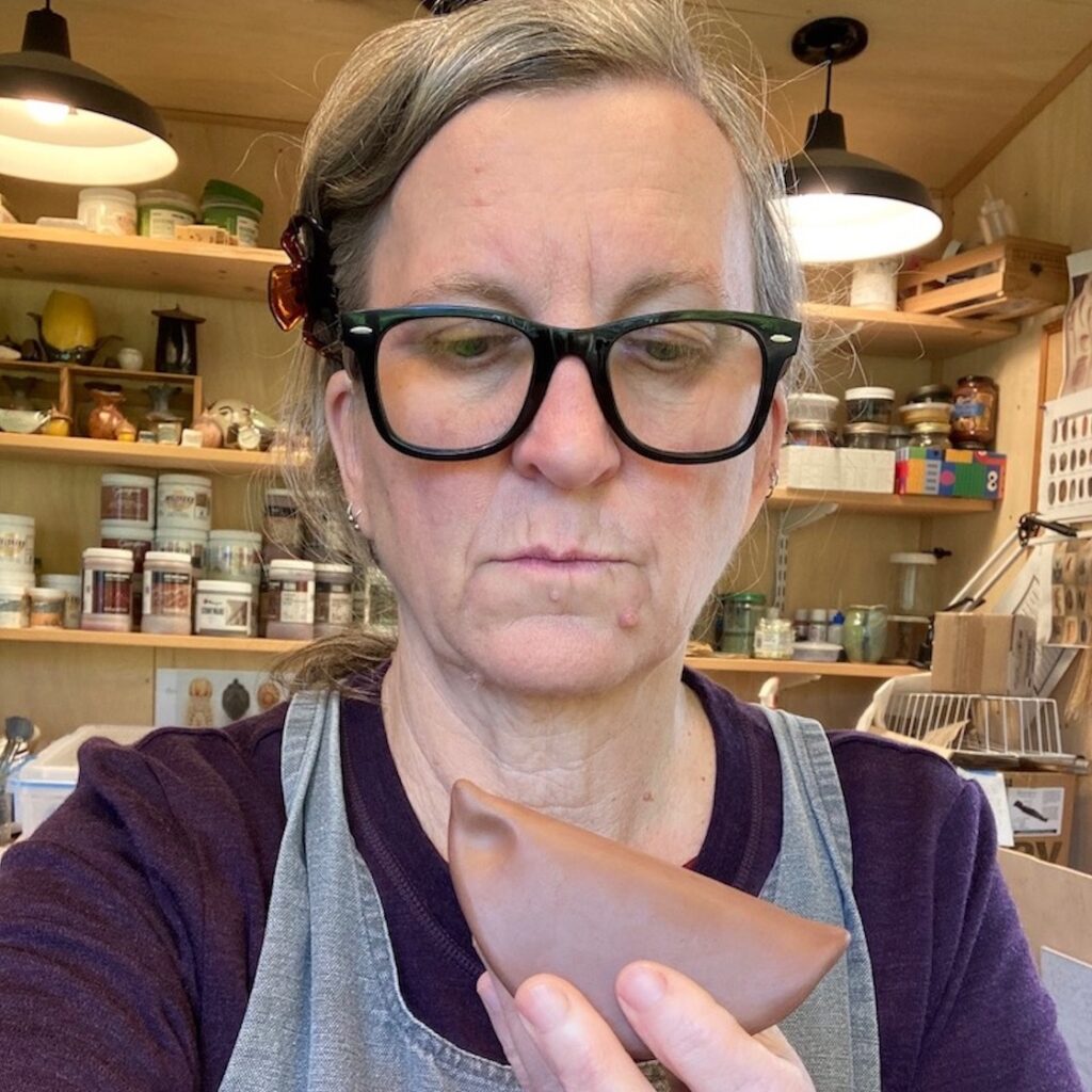About me: I have played and worked in clay off and on since the mid 1970s (earlier, if you count Play-Doh). Clay has been a companion, a means of expression and exploration, and the medium where I was always at home. A few years ago, I finally realized my dream of a backyard studio and kiln shed (yay for the illusion of being in control of one’s space ha ha) and since then my work has moved in wonderful directions I never could have foreseen. There’s a lot to be said for solitude and its impact on the creative process.