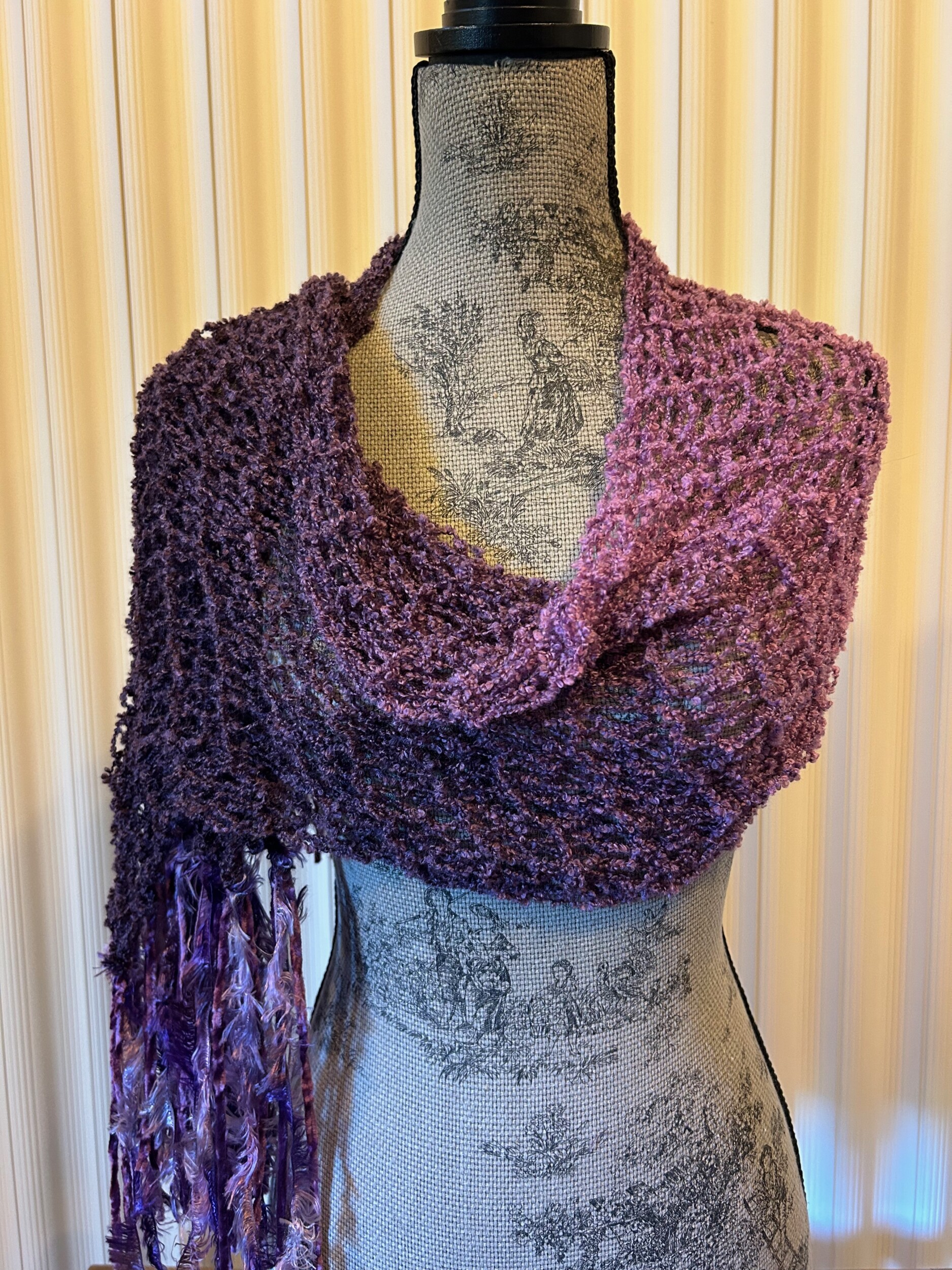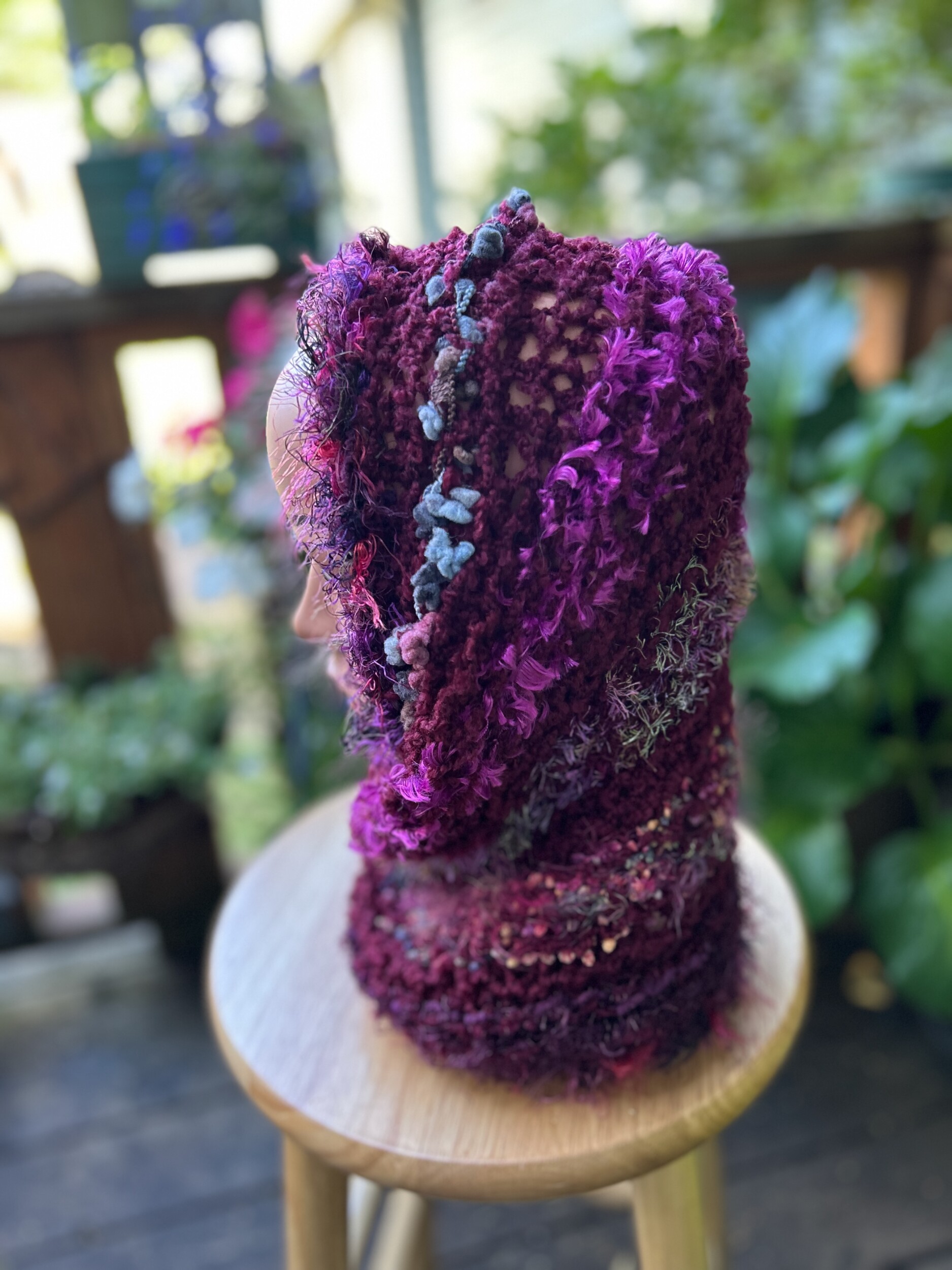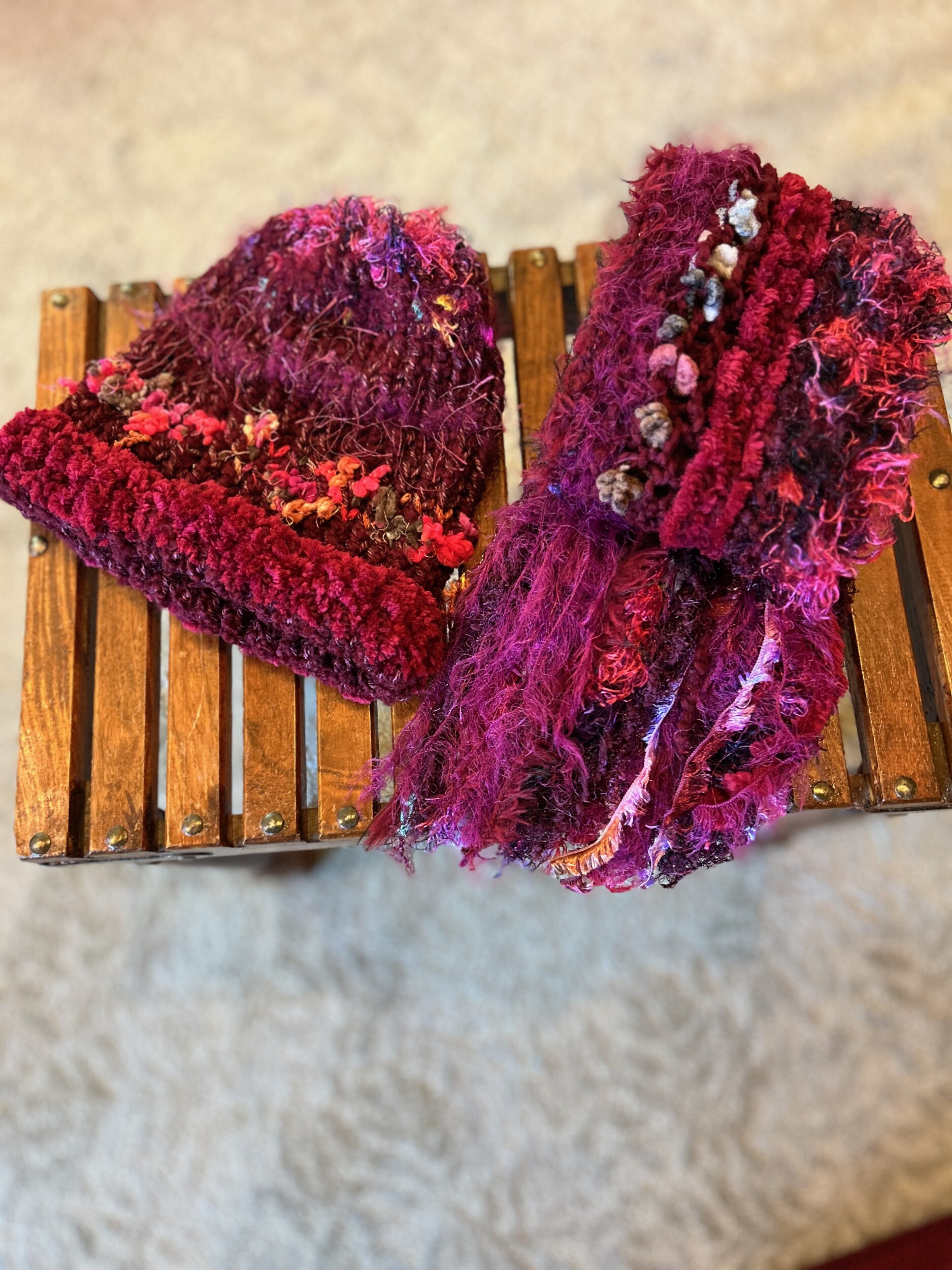 Knitwits’ scarves, hats and ponchos are all handmade from an exciting combination of yarns and threads, the variety of which has come a long way since the “old days,” when Grandmother sat in her rocking chair making thick, scratchy, heavy woollens in questionable colors!