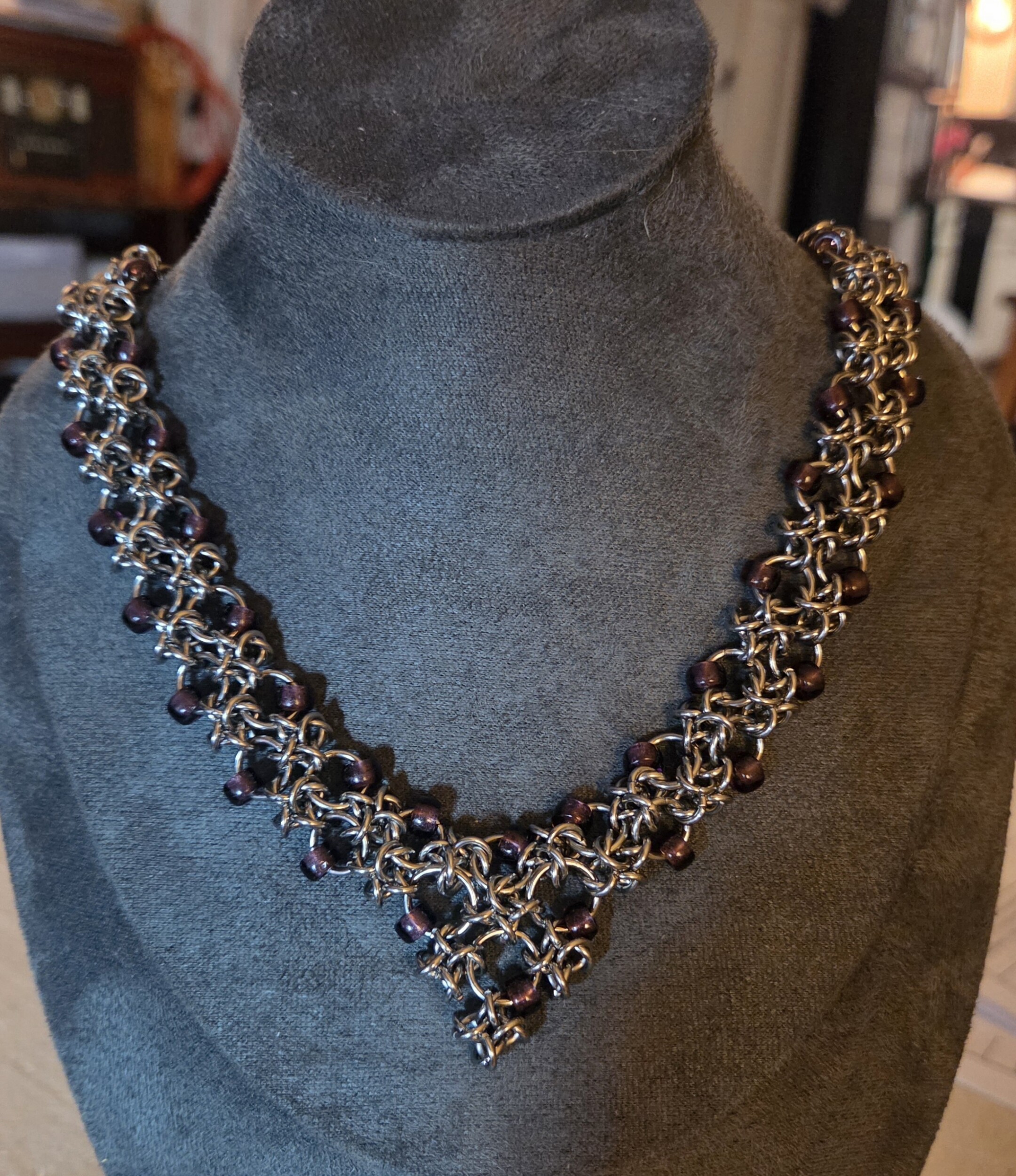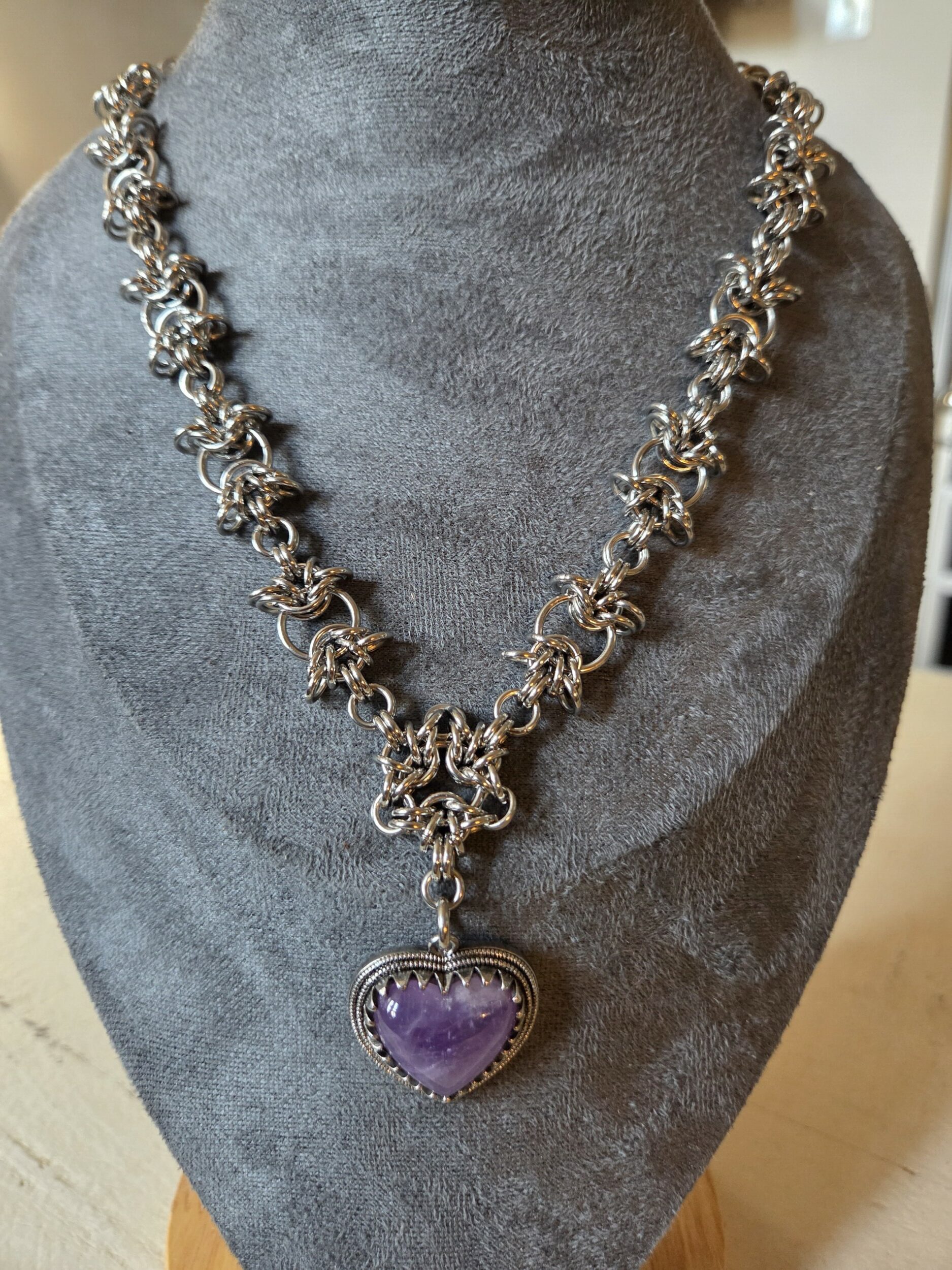 Lesterina creates bold and eye-catching jewelry using many different patterns of chainmail. Her pieces often incorporate more than one chainmail weave, and many are adorned with pendants and charms that complement her distinctive style. From large and chunky statement pieces to dainty micromaille items, Lesterina’s jewelry appeals to many different subcultures, but the tags she uses most often are witchy, bohemian, gothic and bold. She weaves with jump rings made of hypoallergenic, 316 stainless steel, and her pieces are durable and easy to care for.
