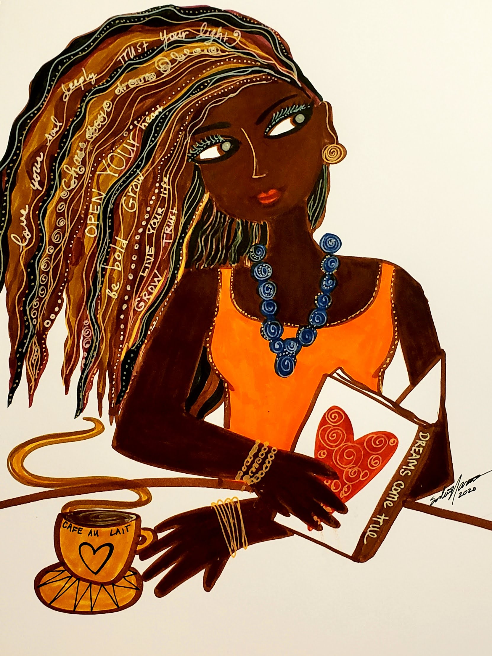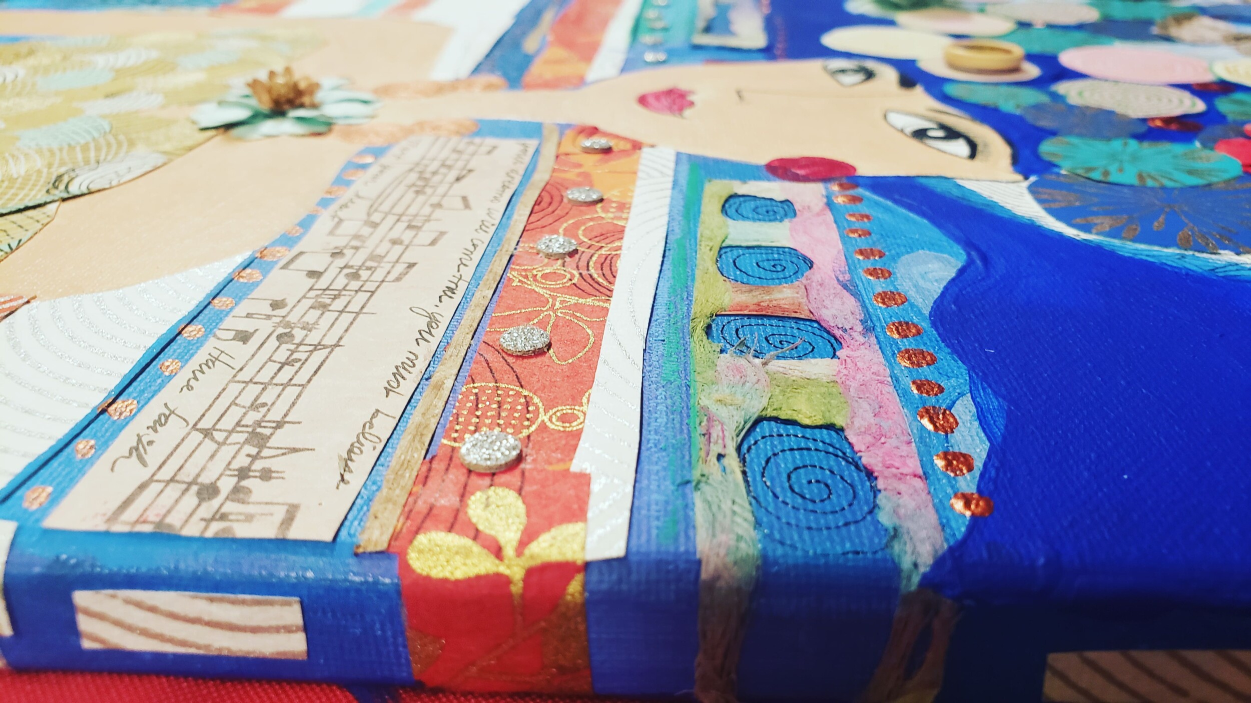 An artist since a young age, Sophie has been promoting her artwork for over 40 years, primarily based in Eugene, OR. Her deep appreciation for fashion designs found in old Vogue books serves as a primary source of inspiration, fueling her love for patterns, lines, and color. Sophie’s artistic process often involves creating rich textures through mixed media, incorporating elements such as stationery, tissue paper, paper flowers and butterflies, sparkling glitter, and brush pens. She is currently expanding her material repertoire by working with yarn, exploring techniques like needle punching and knitting. Her early artistic development was nurtured by her mother, an artist who painted ceramic tiles in her own unique style, encouraging Sophie’s first attempts to mimic and then develop her own creative flow.