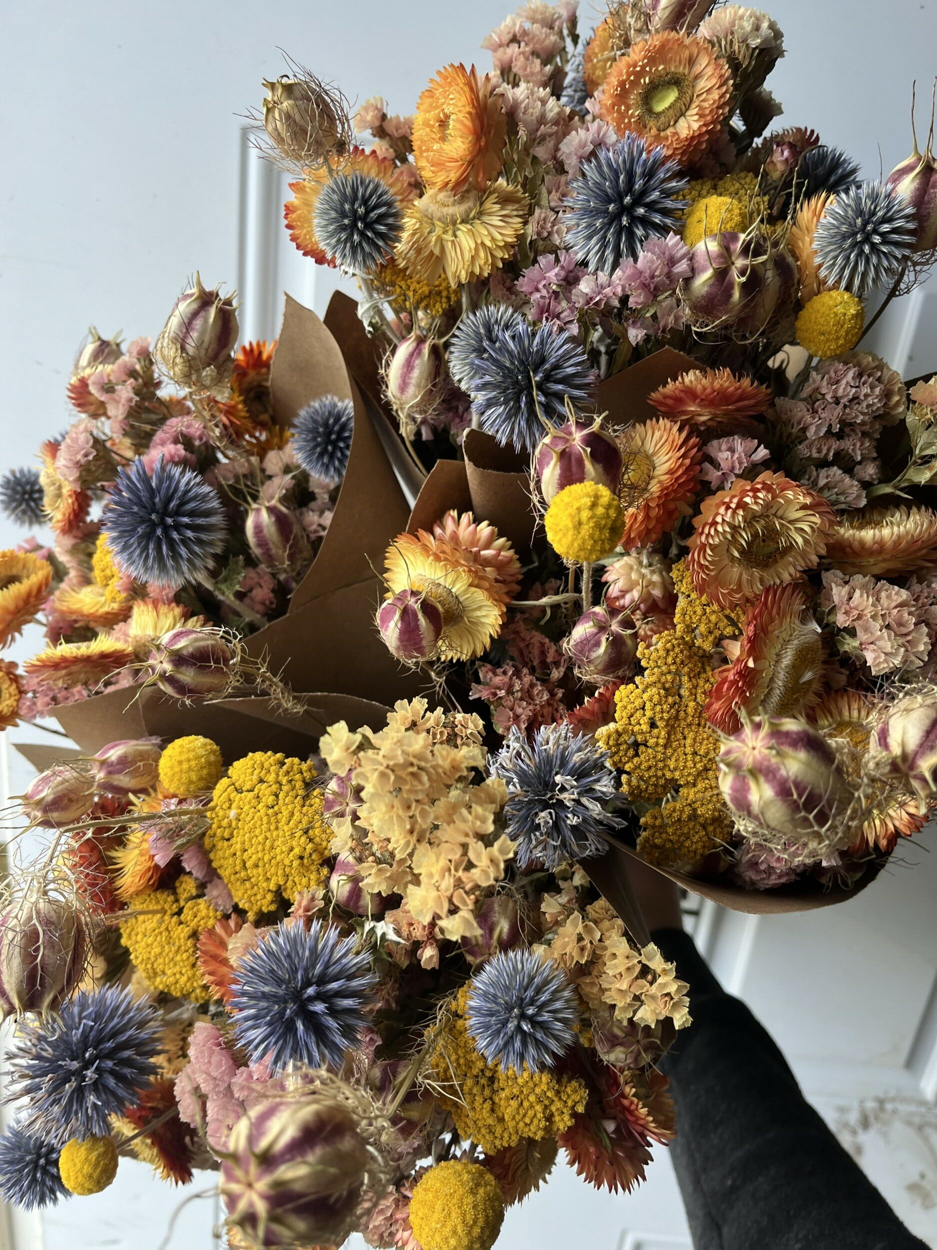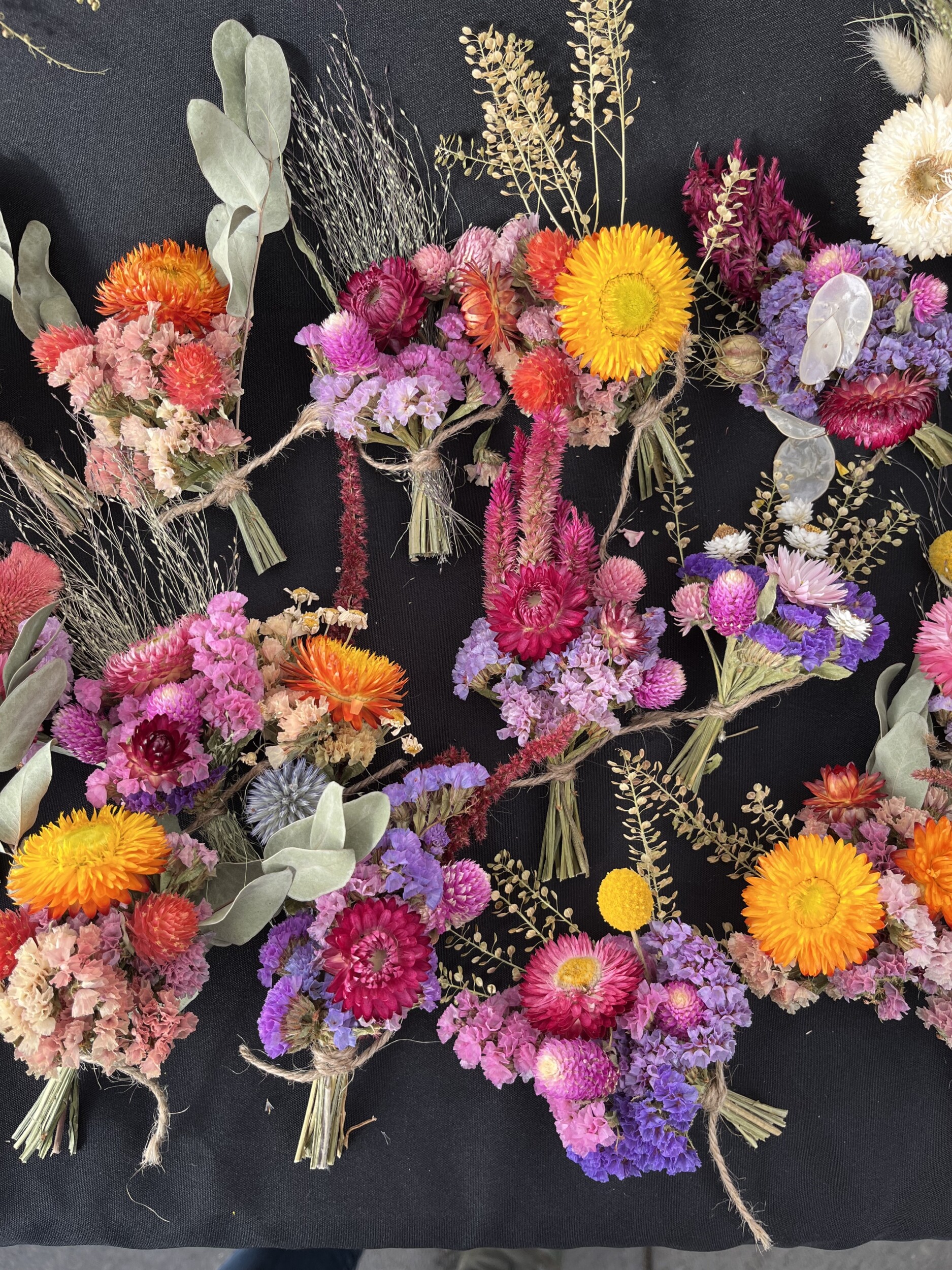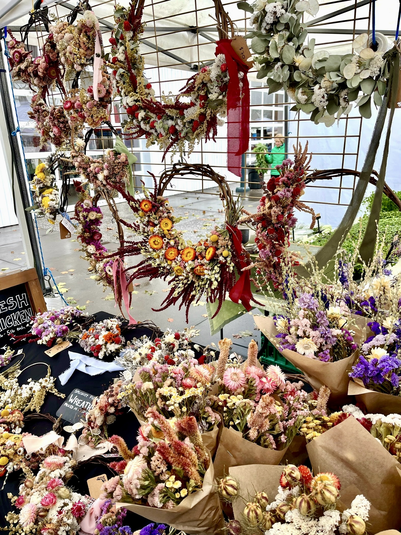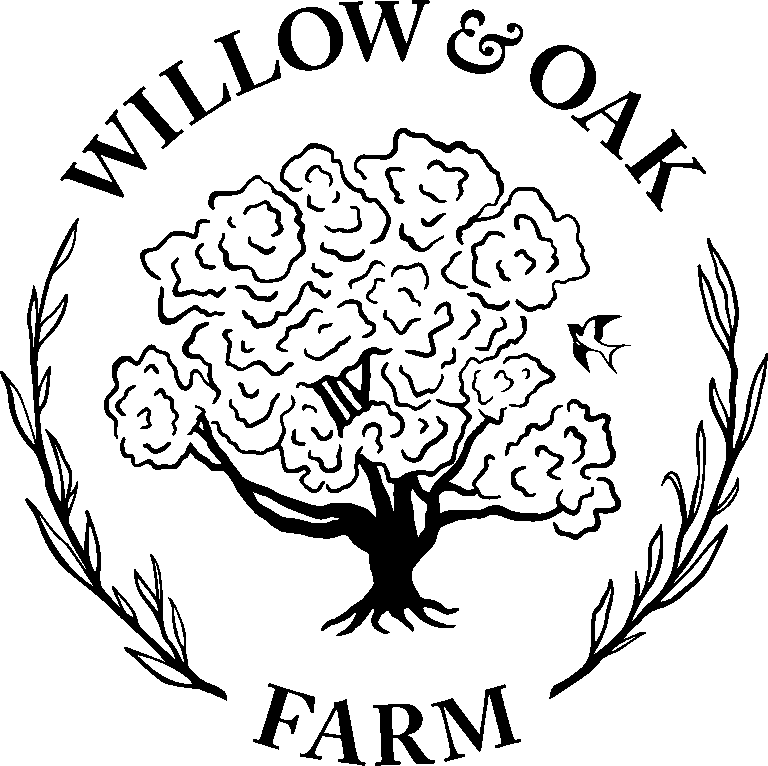 We use all organic methods (although are not certified organic at this time), and are committed to farming practices that are safe for people and our local environment. The flowers and foliages we use in our dried flower products are pesticide-free and were grown using pollinator-safe methods. When not at Holiday Market, you can find Willow & Oak fresh and dried cut flowers at Lane County Farmers Market, through our CSA program, and through local, sustainable florists in the Eugene/Springfield area. You can find our pasture-raised chicken and eggs also at LCFM, through CSA, and at local grocery stores like Main Street Market and Friendly Street Market.