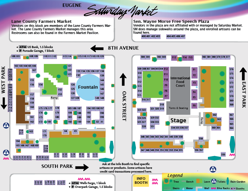 The Eugene Saturday Market is a vibrant marketplace and community celebration that’s been a local tradition for over 50 years! Come, rain or shine, and explore the market every Saturday from the first weekend of April through the first or second weekend of November. We’re located on the Park Blocks at 8th and Oak Street in downtown Eugene, and we’re open from 10:00 AM to 4:00 PM.