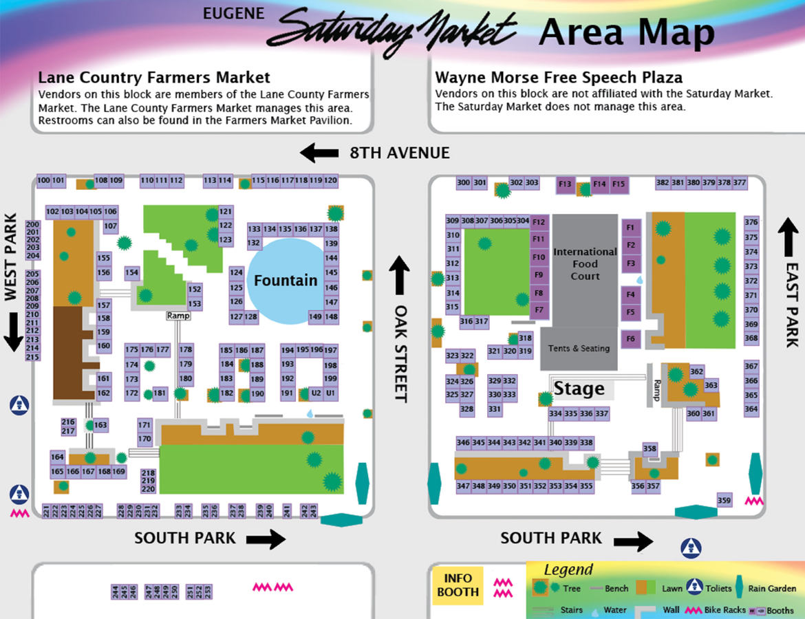 The Eugene Saturday Market is a vibrant marketplace and community celebration that’s been a local tradition for over 50 years! Come, rain or shine, and explore the market every Saturday from the first weekend of April through the first or second weekend of November. We’re located on the Park Blocks at 8th and Oak Street in downtown Eugene, and we’re open from 10:00 AM to 4:00 PM.