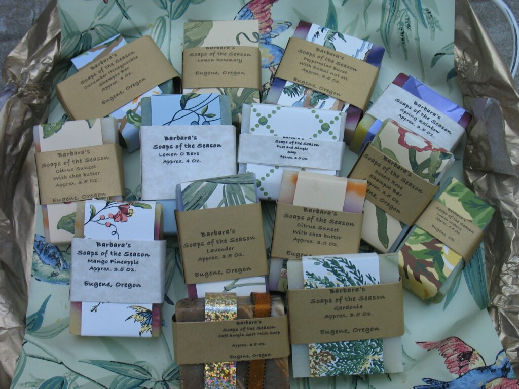 Barbara’s Soaps of the Season has been with Eugene Saturday Market since 2010. David and I offer over 90 kinds of soaps, 14 different shampoo bars, shaving soaps, natural deodorants, lip balms, solid lotion roll ups, and even dog shampoo all made in our kitchen in Eugene. David finds beautiful papers to wrap the soaps that help show off their colors and scents so that each soap already looks like a pretty package. I use six mild plant-based oils plus shea butter in most of my soaps to make them luxurious and moisturizing. I also have exfoliating soaps like Gritty Gardeners Soaps, lavender, many goat milk soaps, herbal, fruity, Pacific NW soap fragrances, and many more. Barbara’s Soaps of the Season is also on Etsy (Bhascall.Etsy.com) in case you can’t make it to the Market or you can contact me on my cell phone.